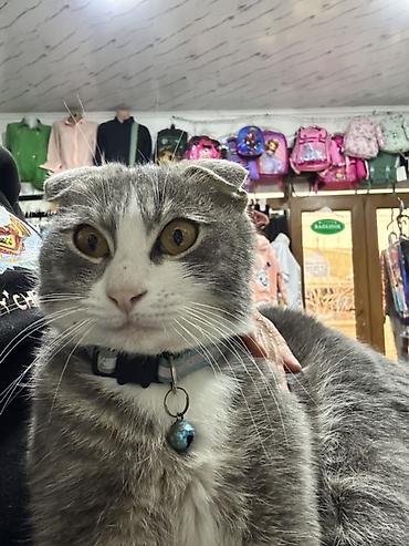 Şotland qatı (Scottish Fold) tipli boz-ağ pişik - Rəng: tünd boz kürk, sinədə və pəncələrdə ağ ləkələr - Qulaqlar: tipik “fold” – önə doğru qatlanmış - Gözlər: iri, qəhvəyi - Aksesuar: zəngçikli, ...