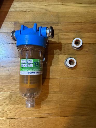 - Atlas Filtri brendi, İtaliya istehsalı şəffaf qaba malik mexaniki/çöküntü filtri. Korpus üzərində texniki göstəricilər: maksimum təzyiq 8 bar (116 psi), temperatur +45°C-yə qədər, pH 6.5–9.5 aralığı. Aşağı hissədə axıntı/çıxarış üçün rezbeli drenaj çıxışı var.