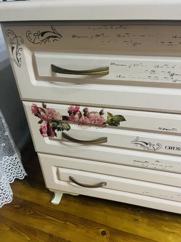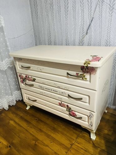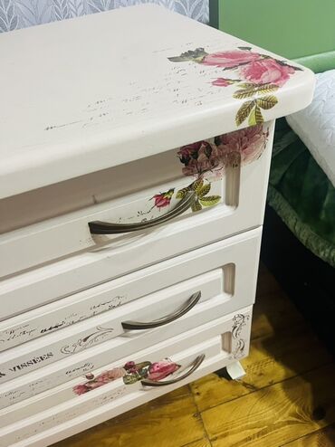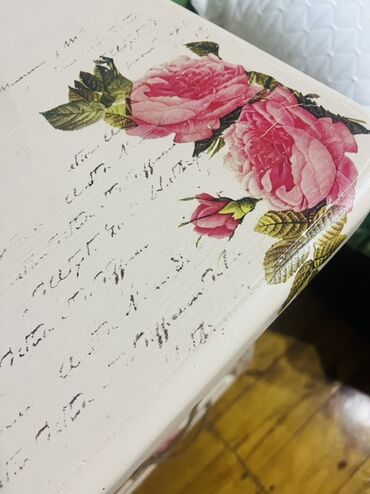 - Üslub: romantik vintage; üst səthdə, ön və yan panellərdə güllü dekal və əl yazısı motivləri