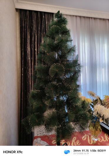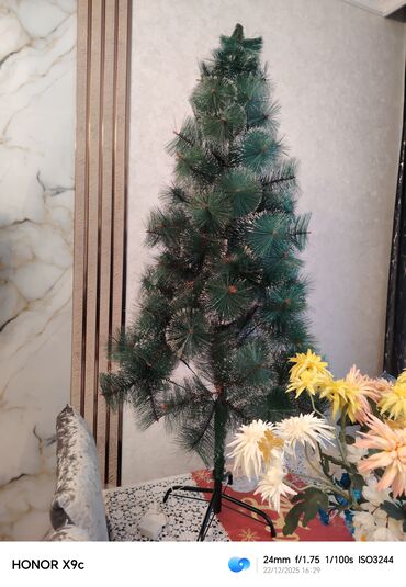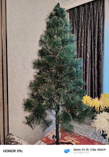Süni Yeni il şam ağacı - Material: PVC iynəciklər, qar effektli uclar - Rəng: tünd yaşıl, ağ “qar” vurğuları - Hündürlük: təxmini 1.8–2.0 m (şəkilə əsasən tam ölçülü otaq ağacı) - Konstruksiya: me...