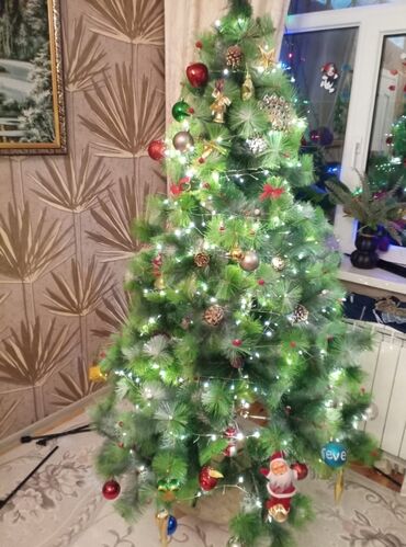Süni Yeni il şam ağacı və bəzək dəsti - Realistik iynələrə malik, budaqları sıx süni şam ağacı - Ölçü: təxminən 1,6–1,8 m hündürlük (fotolara baxın) - Üç hissədən yığılır, möhkəm metal dayaq üzəri...