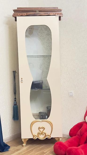 Ölçülər (təxmini, şəkilə əsasən): hündür və ensiz konstruksiya, az yer tutur, vitrini önə çıxarır.