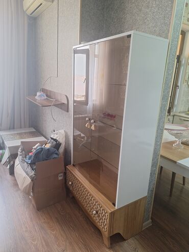 - Material: ağ korpus, ön hissədə şəffaf tünt şüşə qapılar; içində 2 ədəd şüşə rəf