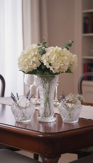 Kəsimli şüşə vaza dəsti - Sayı: 3 ədəd - Material: qalın, şəffaf şüşə (kristal üslubunda kəsim naxışları) - Dizayn: ulduz və romb motivli əl işi tipli kəsimlər; biri dalğalı kənar, biri düz kənar,...