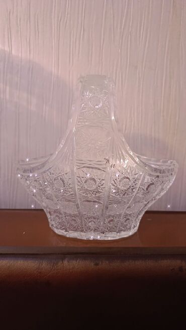 Kəpəkli kəsim naxışlı kristal dəst - Tərkib: 3 hissə - 1 ədəd hündür vaza (güldan) – enli ağız, qalın diblik, klassik “xrustal kəsim” bəzəkləri - 2 ədəd səbət formalı şirniyyat/çiçək qabı – or...