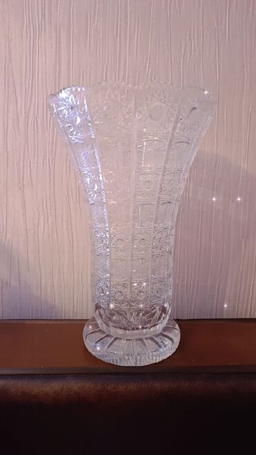 Kəsimli büllur vaza (xrustal) - Material: ağır büllur şüşə (xrustal) - Dizayn: çoxüzlü siluet, dərin əl kəsməli naxışlar (ulduz və romb motivləri), işığı güclü şəkildə qırıb-parıldadan fasetlər -...