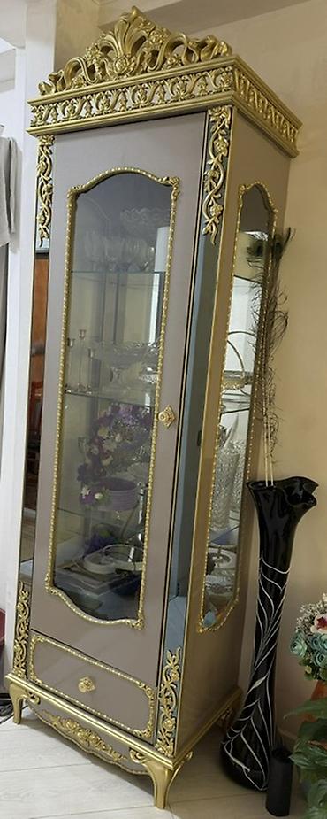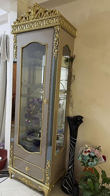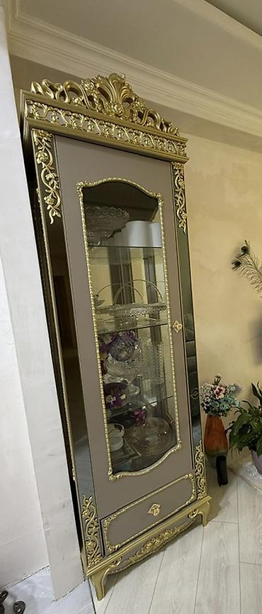 - Materiallar: Şüşə vitrin qapısı və yan panellər, içəridə şüşə rəflər. Taxta/MDFlə hazırlanmış korpus və alt hissə, relyefli qızılı ayaqlar.