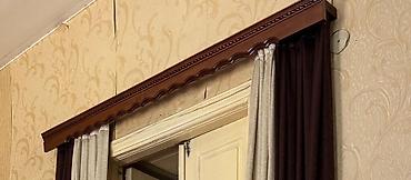 - Pərdə karnizi: taxtadan, klassik naxışlı karniz başlığı; ikili pərdə üçün uyğundur (qalın və tül).