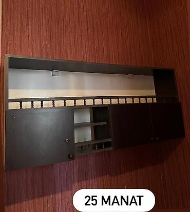Mebel modulü – divar asma dolabı - Material: ağac teksturalı laminat/MDFlam - Rəng: qəhvəyi, taxta naxışlı - Konstruksiya: iki bölməli; hər bölmədə ayrıca rəf - Ön panellər: 2 ədəd aşağıya açılan ...