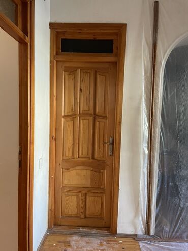İç qapılar dəsti - 2 ədəd taxta qapı - Material: təbii ağac - Qəhvəyi qapı: 4 şüşəli panel dizaynı, yuxarı və aşağıda dar ventilyasiya pəncərələri; mat teksturalı şüşə; metal qapı dəstəyi və kilid...
