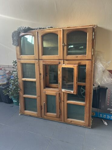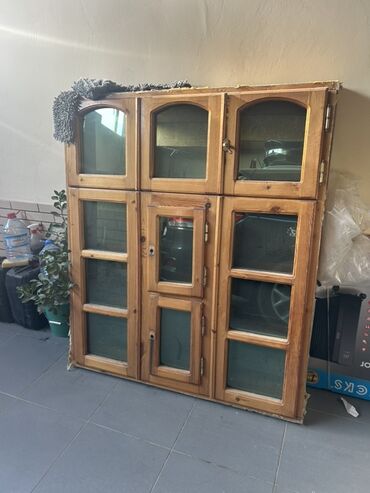 Taxta-şüşə vitrin/dolab - Material: Təbii ağac karkas, şüşə qapılar - Rəng: Açıq qəhvəyi (taxta teksturası görünür) - Quruluş: Çox bölməli; yuxarıda tağ formalı şüşəli qapılar, ortada kiçik qapılı...