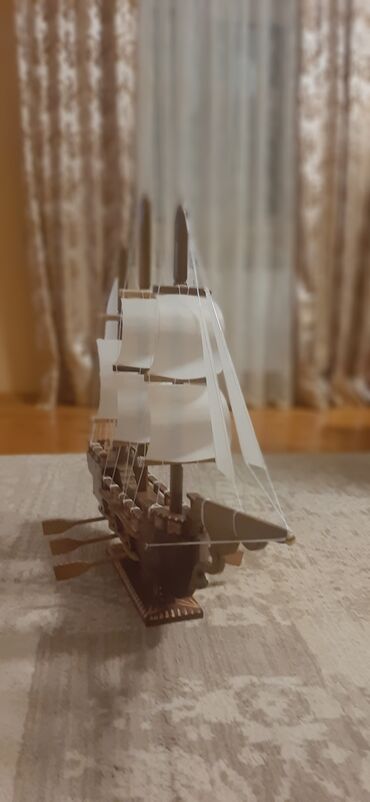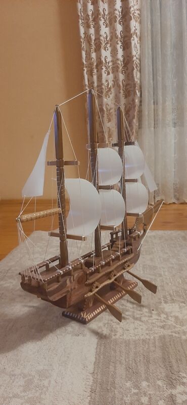 - Material: tamamilə ağacdan hazırlanmış korpus, mastlar və dayaq; ağ rəngli plastik/yumşaq materialdan yelkənlər; ip saplarla detallı arma-qaçış sistemi.