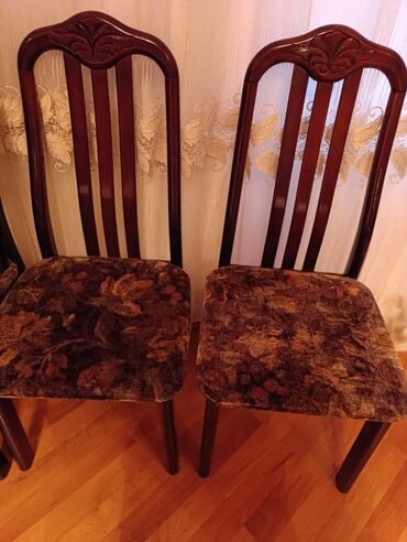 Taxta çərçivəli yumşaq oturacaqlı stullar dəsti. - Material: massiv taxta konstruksiya, arxa hissədə dekorativ oyma detalları. - Rəng: tünd qəhvəyi çərçivə, açıq qəhvəyi/krem tonunda parça oturaca...