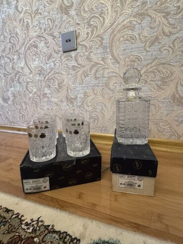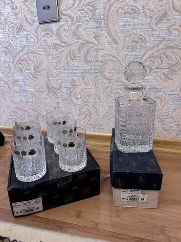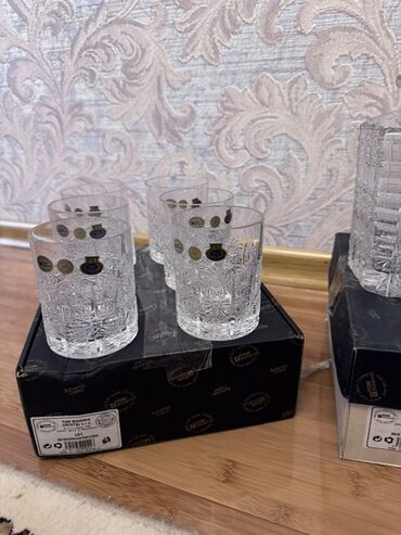 - 6 ədəd viski stəkanı (qutuda). Klassik kəsmə naxışlı, qalın dibli, silindrik forma.