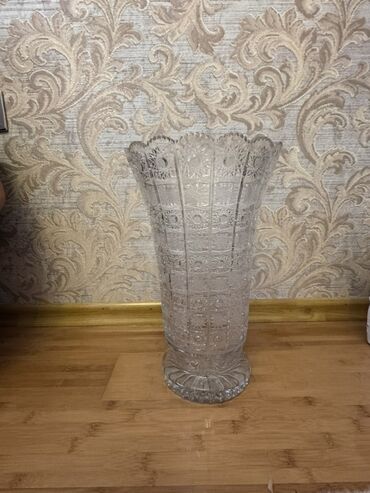 Şüşə/kristal vaza - Material: qalın, aydın şüşə (kristal effekti ilə) - Forma: silindrik, yuxarıdan genişlənən hündür model - Dizayn: çoxüzlü səth, şaquli panellər və təkrarlanan oyma/naxışlı orna...
