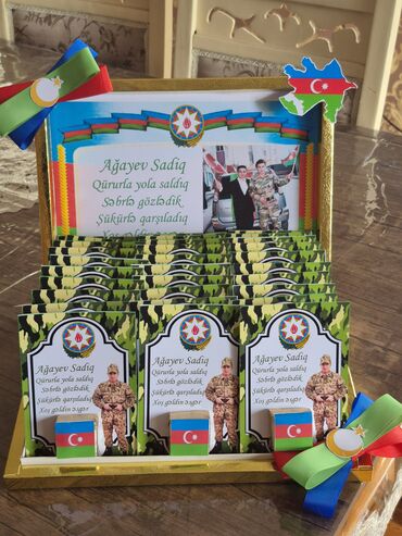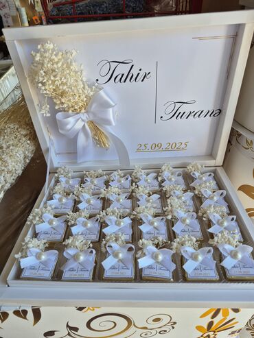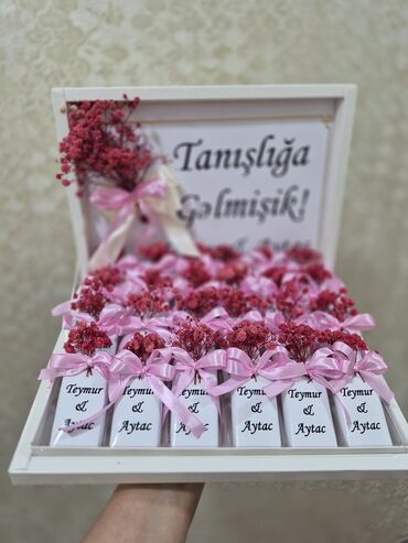 - Nişan, toy, xınayaxdı, tanışlıq və niyyət günləri üçün zərif dizaynlı, üzərində cütlüyün adları və tarix yazılan şokoladlar.