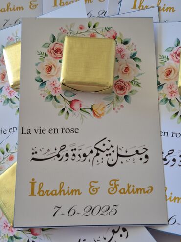 - Kart üzərində mini şokoladlı xatirə suvenirləri: çiçək kompozisiyalı kart, istəyə uyğun yazılar (məsələn, “La vie en rose”, ayə/ifadələr), adlar və tarix.