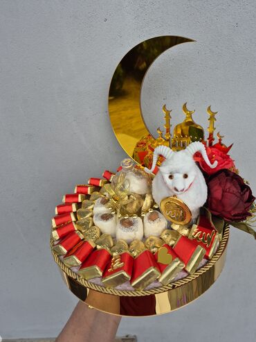 - Bayram və dini mərasimlər üçün tematik şokolad kompozisiyası: aypara və məscid fiqurlu qızılı güzgü səthli tray, dekorativ qoç oyuncağı, lokum və assorti şokoladlarla bəzədilmiş dairəvi təqdimat.