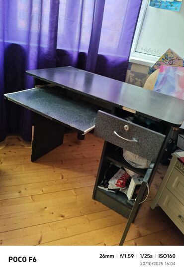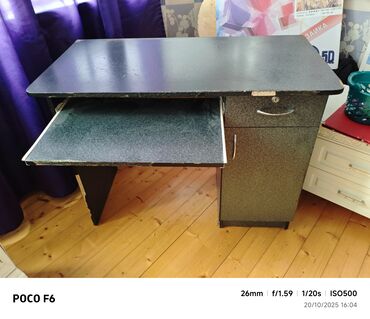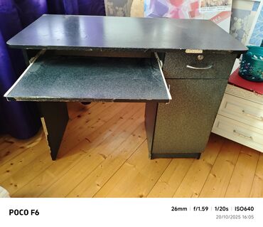 Kompüter/iş masası - Rəng: tünd qəhvəyi/qaraya yaxın - Material: laminat/LDSP səth, metal tutacaqlar - Geniş, düz iş səthi – yazı, komputer və aksesuarlar üçün rahat - Klaviatura üçün çıxarılan rə...