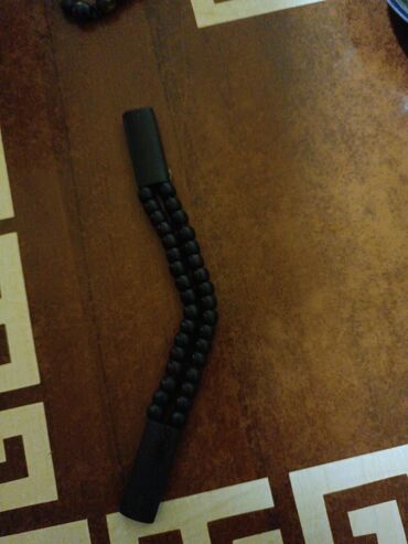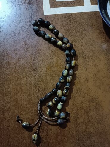 - Qara‑krem qarışıq rəng keçişli oval muncuqlu, düyünlü iplə, uclu bəzəkli model.