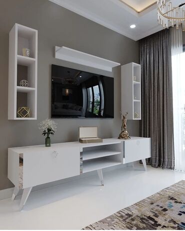 - Müasir minimal dizayn: aşağı TV tumbası + divar rəfi və açıq bölməli asma modullar.