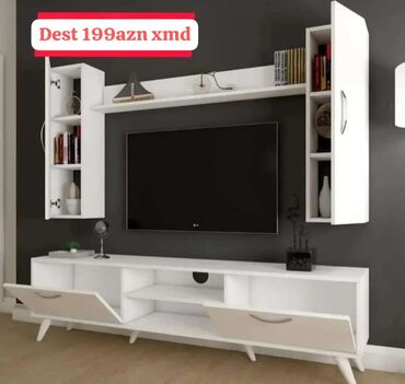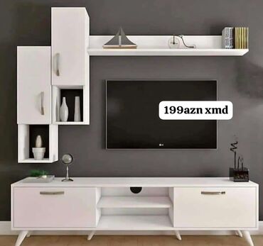 - Komplekt: aşağı TV tumbası + yuxarı uzun raf + iki yan divar modulu (qapılı və açıq bölmələr)