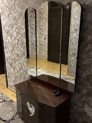 Taxtalı makiyaj/çiynə aynalı konsol - Üçlü güzgü sistemi: ortada sabit böyük güzgü, iki yanda menteşəli qanadlar — bucağı tənzimlənir, saç və makiyaj üçün yan görüntünü təmin edir. - Üst hissə: ge...