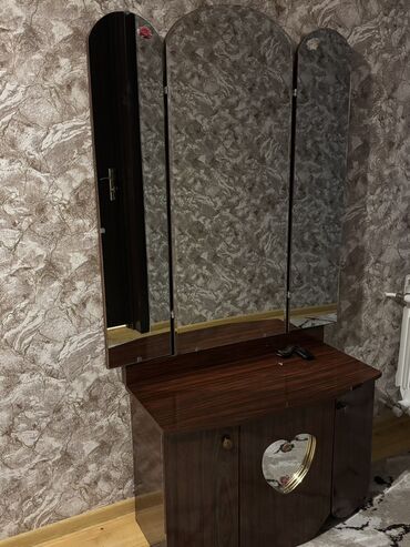 Taxtadan hazırlanmış güzgülü vizaj/komod stolu - Klassik tərzli, qəhvəyi rəngli taxta stol - Yarımtağ formalı iri güzgü üst hissədə - İki tərəfdə qapalı dolab bölməsi - Hər iki tərəfdə kiçik çekme...