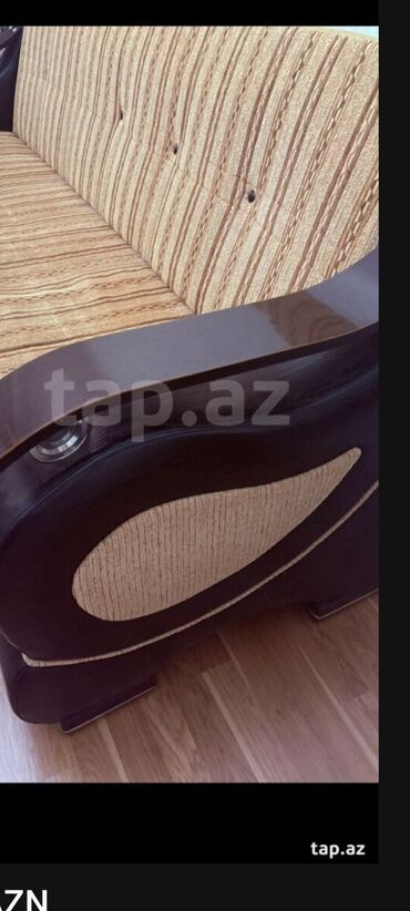 - Rəng və material: Bej-qəhvəyi zolaqlı toxuma parça oturacaq və arxa hissə. Parça üstündə dekorativ düymələr.