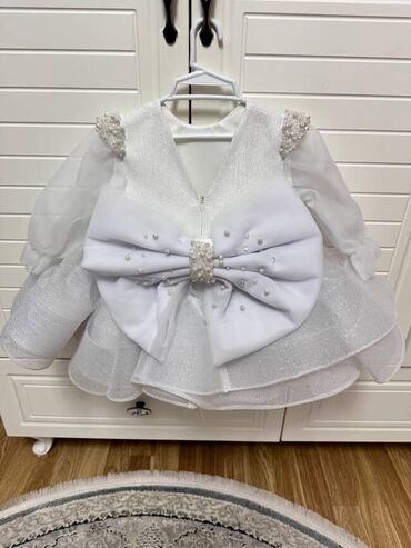 Ağ rəngli qız uşaq paltarı 1 dəfə istifadə edilib - Model: klassik A-kəsim, ətəyi dalğalı və həcmlidir - Material: parıldayan atlas/şifon tipli parça, yüngül və zərif - Rəng: saf ağ - Üst hissə: qo...
