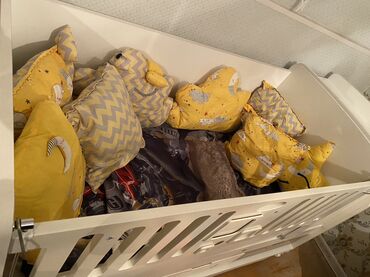 - Beşikdə sarı rəngli yastıq dəsti və qoruyucu bordür yastıqları görünür