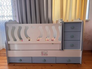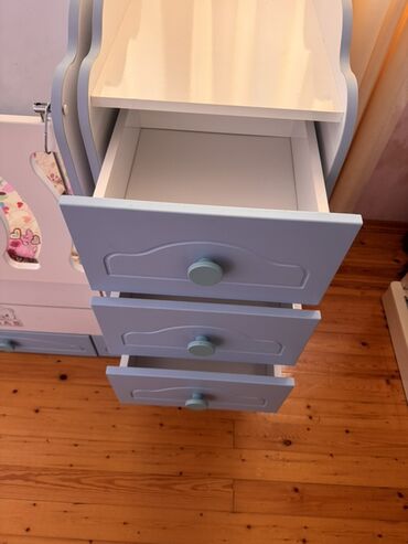 Funksional həll: beşik + komod + alt saxlama siyirmələri – paltar, uşaq ləvazimatı və oyuncaqlar üçün geniş yer. Uşaq otağına uyğun zərif dizayn və praktik təşkilat imkanı.