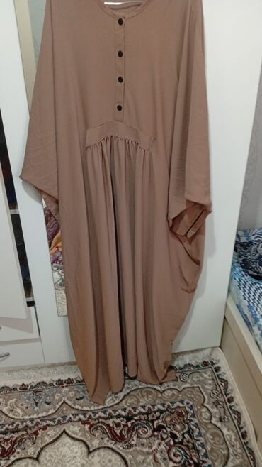 1) Qəhvəyi rəngdə uzun, geniş kəsimli paltar/abaya. Dairəvi yaxa, ön hissədə düyməli plan (4 düymə), bel xəttində yığma büzgü, boş qollar və yanlarda rahat kəsim.