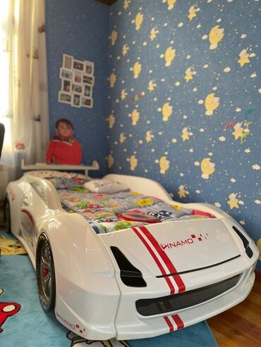 - Avtomobil şəklində uşaq çarpayısı: ağ rəng, qırmızı zolaqlar və “Dinamo” loqosu, aerodinamik yan panellər, realist ön panjur və faralar görünüşü, təkər detallarına malik yan hissələr. Aşağı profilli korpus sayəsində uşağın çarpayıya asan minib-düşməsi rahatdır.