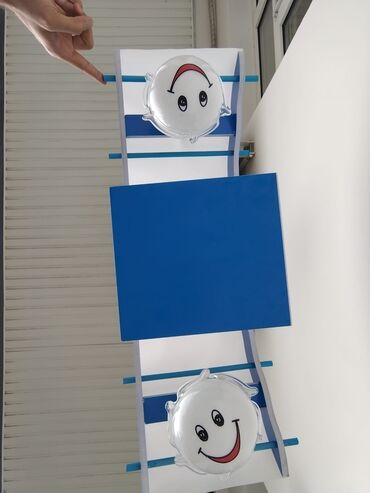 - Dizayn: Mavi-ağ rəngli, uşaq mövzulu dekor. Ortada kiçik “gondol”/səbət formasında element və balaca oyuncaq fiqur, ön hissədə dekorativ pervane. Yanlarda şüşə plafonlu iki işıq nöqtəsi, ortada əlavə plafon.