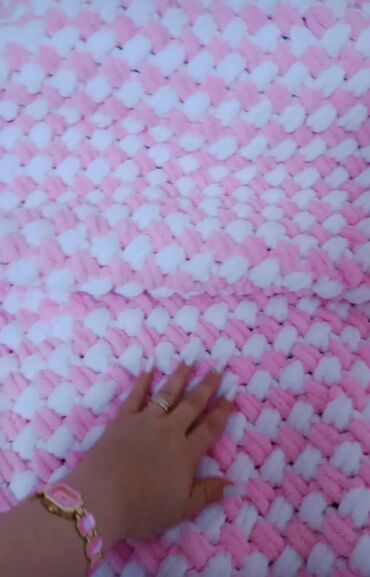 Plyonka ipdən toxunmuş, zəncirvari naxışlı əl işi plaşet/pled kolleksiyası. Xüsusiyyətlər: - Material: yumşaq, tüklü “plüș/chenille” ip; dərini qıcıqlandırmır, ilıq saxlayır - Toxunuş: qalın hörmə...