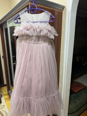Bir defe toya geyınılıb Uşaq üçün zərif ziyafət/gecə geyimi - Rəng: Pudra/solğun çəhrayı - Model: Tüllü ətəkli, A-kəsim, dizə yaxın uzunluq - Üst hissə: Ön tərəfdə büzgülü korse detalları, enli ...