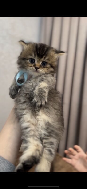 Skottish Fold balası – qısaqulax, zolaqlı-boz rəngli, ağ sinə və pəncələr. Yumşaq, sıx tüklü örtük, iri ifadəli gözlər, xırda qəhvəyi burun. Çox mehriban, insanla təmasa gələn, oynaq və sakit xasiy...
