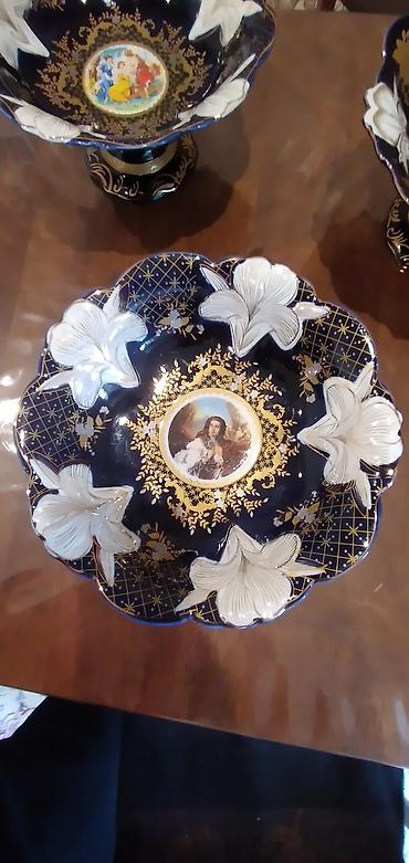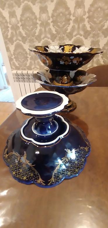 Mavi-qızılı klassik üslubda dekorativ meyvə/gül vazaları – 3 ədəd dəst.