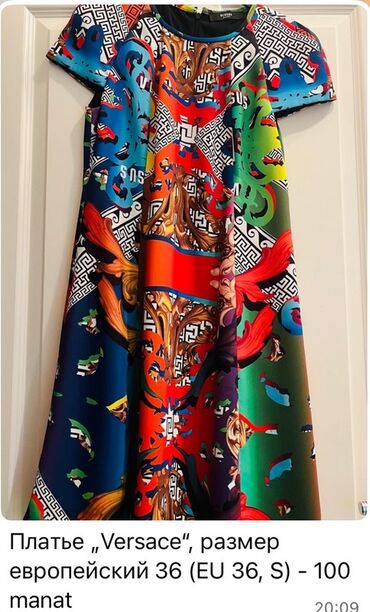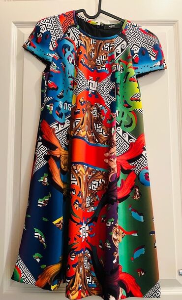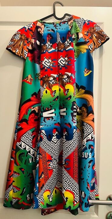 - Print: Versace-yə xas barokko motivləri və qrafik naxışların qarışığı; çoxrəngli (qırmızı, mavi, yaşıl, narıncı, ağ-qara elementlər)
