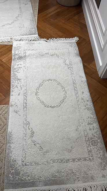 1) Açıq boz/ağ rəng palitrasında klassik ornamentli, mərkəzdə dairəvi naxış, kənarlarda zərif haşiyə və püsküllər. Minimalist və müasir interyerlərlə uyumlu.