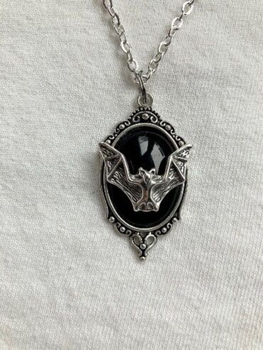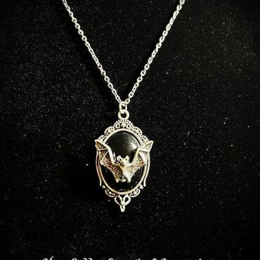 - Dizayn: Qotik üslubda, oval qara fonda detallı yarasa fiquru olan medalon.
