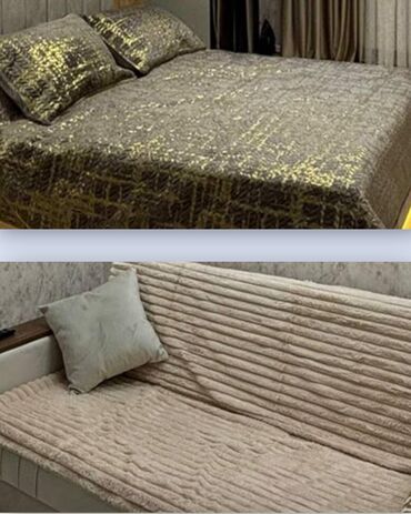 - Yataq otağı üçün parlaq qızılı təsirli, naxışlı örtük. Eyni materialdan iki ədəd yastıq üzü ilə tamamlanır. Parça toxuması zərif parıltı verir, interyerə elit görünüş qatır. Örtük tam ölçülü iki nəfərlik çarpayıya uyğundur, kənarları səliqəli biçimlənib, mövsüm boyu istifadə üçün uyğundur.