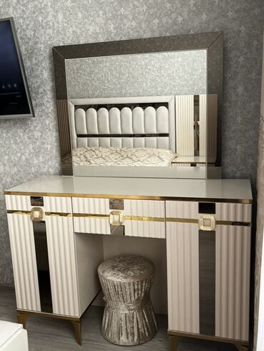 - Makiyaj masası: iri güzgü, 3 çekmece və 2 dolab bölməsi, qızılı detallar; yanında parçaüstü puf