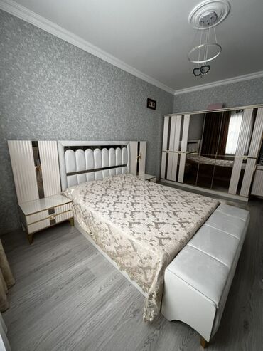 Yataq otağı mebel dəsti Dəst tərkibi: - İki nəfərlik çarpayı (aşağısı bazalı, taxta karkaslı). - Geniş sürgülü qapılı şkaf: bir qapısı güzgülü, digər qapısı krem rəngdə; ortadan dekorativ qızılı n...