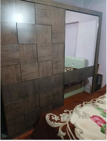 - Geniş sürgülü qapılı şkaf – bir qapısı boy güzgülü, dekorativ taxta panellərlə