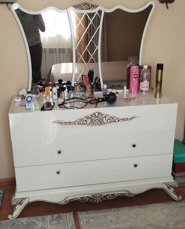 - Geniş komod-güzgü – 2 böyük çekmece, ağ parlaq səth, qızılı naxışlı oyma elementlər, dalğalı kənarlı üç hissəli böyük güzgü (ortada rombşəbəkəli dekor).