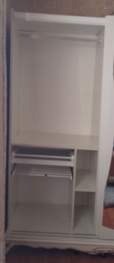- Şkaf: üç bölməli, ortası güzgülü sürüşən qapı.