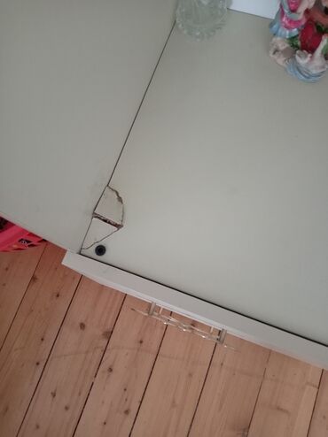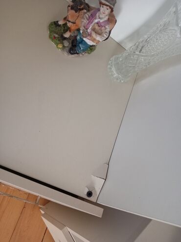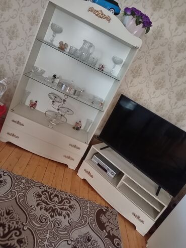 Ağ rəngdə iki hissəli mebel dəsti, interyerinizə zərif görünüş qatır. Dəstə şüşəli vitrin şkafı və televizor altlığı daxildir. Vitrin şkafı şüşə rəflərə və dekorativ elementlərə malikdir, qab-qacaq və ya bəzək əşyaları üçün əla seçimdir. Televizor altlığı isə televizorunuzu yerləşdirmək üçün geniş səthə və əlavə saxlama yerləri təmin edən rəflərə malikdir. Bu dəst oturma otağı və ya qonaq otağı üçün uyğundur. Vitrinin şüşe qapısının biri qiriqi bir siyirmesinin birinin reysi xarabdı alib deyişmek mümkündür