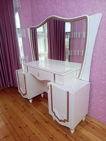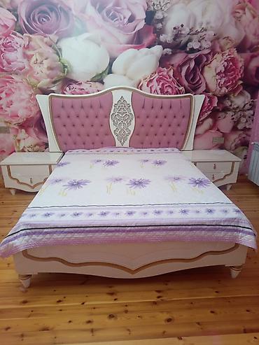 - Çarpayı: klassik üslubda, yumşaq başlıq (kapitone), orta hissədə dekorativ ornament. Stabil ayaqlar, bazaya uyğun karkas.